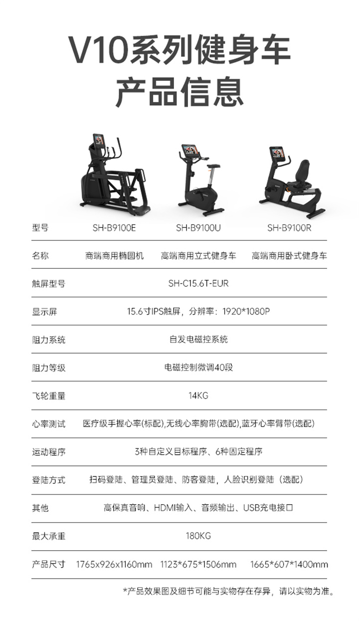 • 产品简介:舒华立式商用健身车SH-B9100U(V10)触屏版拥有超大显示和操作屏幕, 可以任意设置阻力、时间和距离等参数,还可以即时显示心跳和转速等数据,同时,SH-B9100U提供多项科学运动处方,更轻松掌握运动节奏。