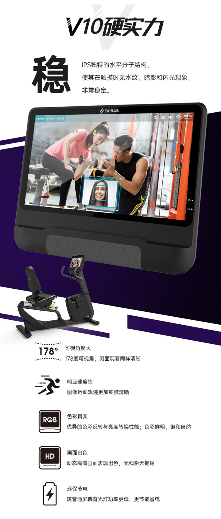 舒华立式商用健身车SH-B9100U(V10)触屏版拥有超大显示和操作屏幕, 可以任意设置阻力、时间和距离等参数,还可以即时显示心跳和转速等数据,同时,SH-B9100U提供多项科学运动处方,更轻松掌握运动节奏。