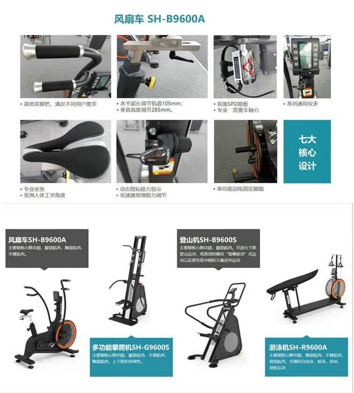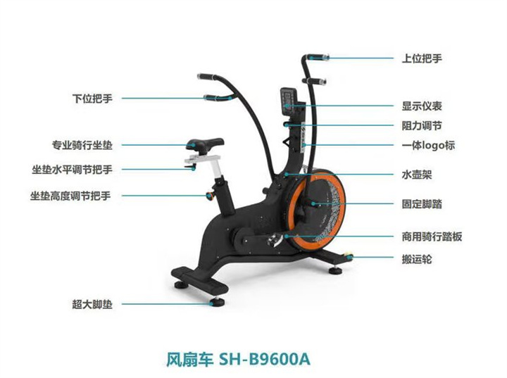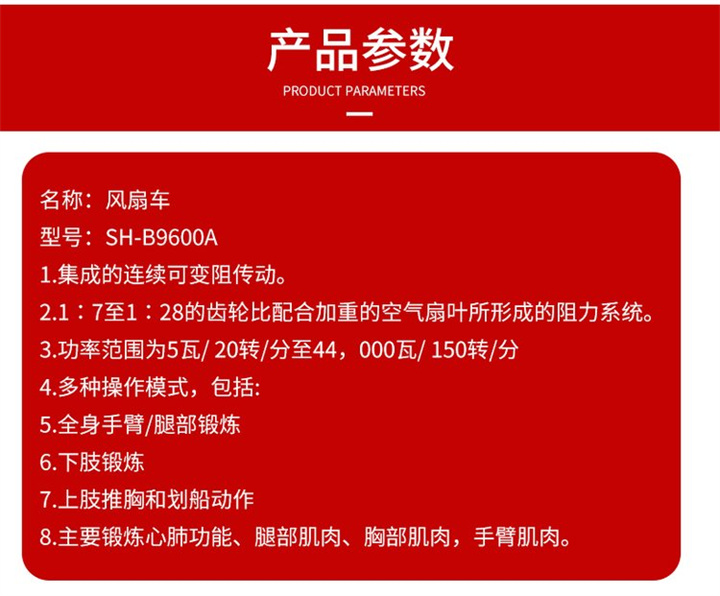 • 产品简介:舒华风扇车SH-B9600A主要锻炼心肺功能、腿部肌肉、胸部肌肉、手臂肌肉。